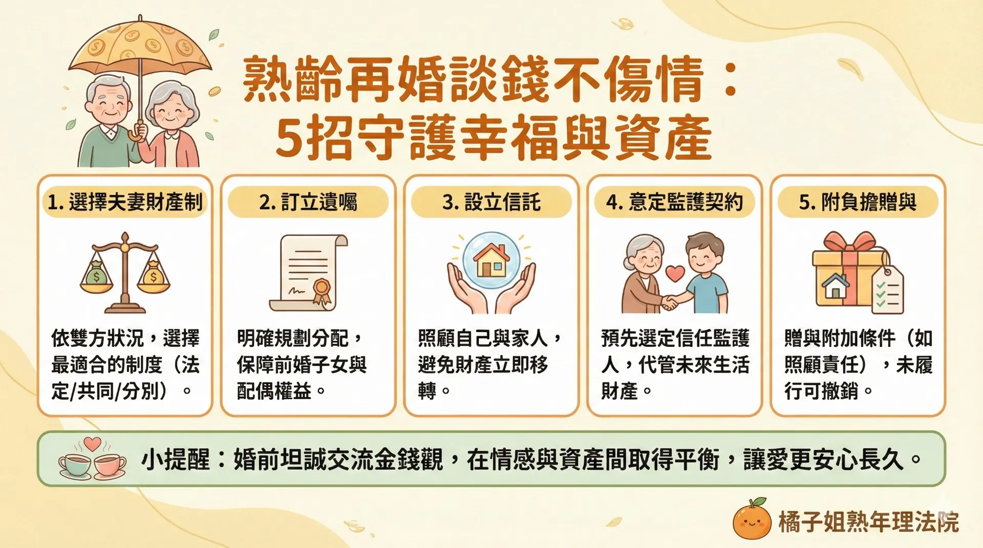 為了讓老後夫妻的居住與生活有保障,同時避免因一時的情感衝動將辛苦累積的財產散盡,甚至引發家庭風波。律師瑋哥建議,熟齡族群在考慮再婚時,應積極利用法律和金融工具來構建防護網。以下提出五個具體建議: