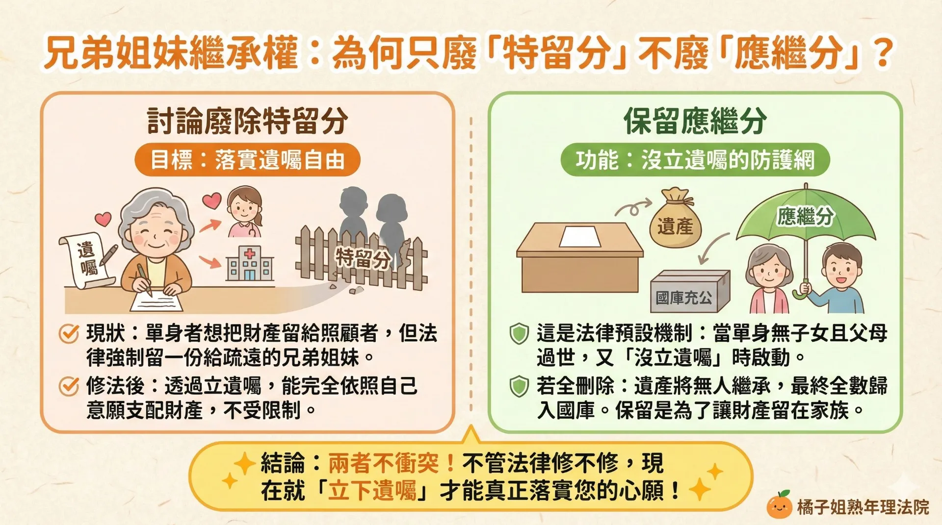所以,這兩者是不衝突的。政府在修法時,考量的是如何在「尊重個人意願」與「維持家族繼承傳統」之間取得平衡。如果你真的不想給兄弟姊妹,只要「立遺囑」就能排除他們的應繼分;但如果你忘了立遺囑,法律保留應繼分,至少讓你的財產不會變成國家的。
