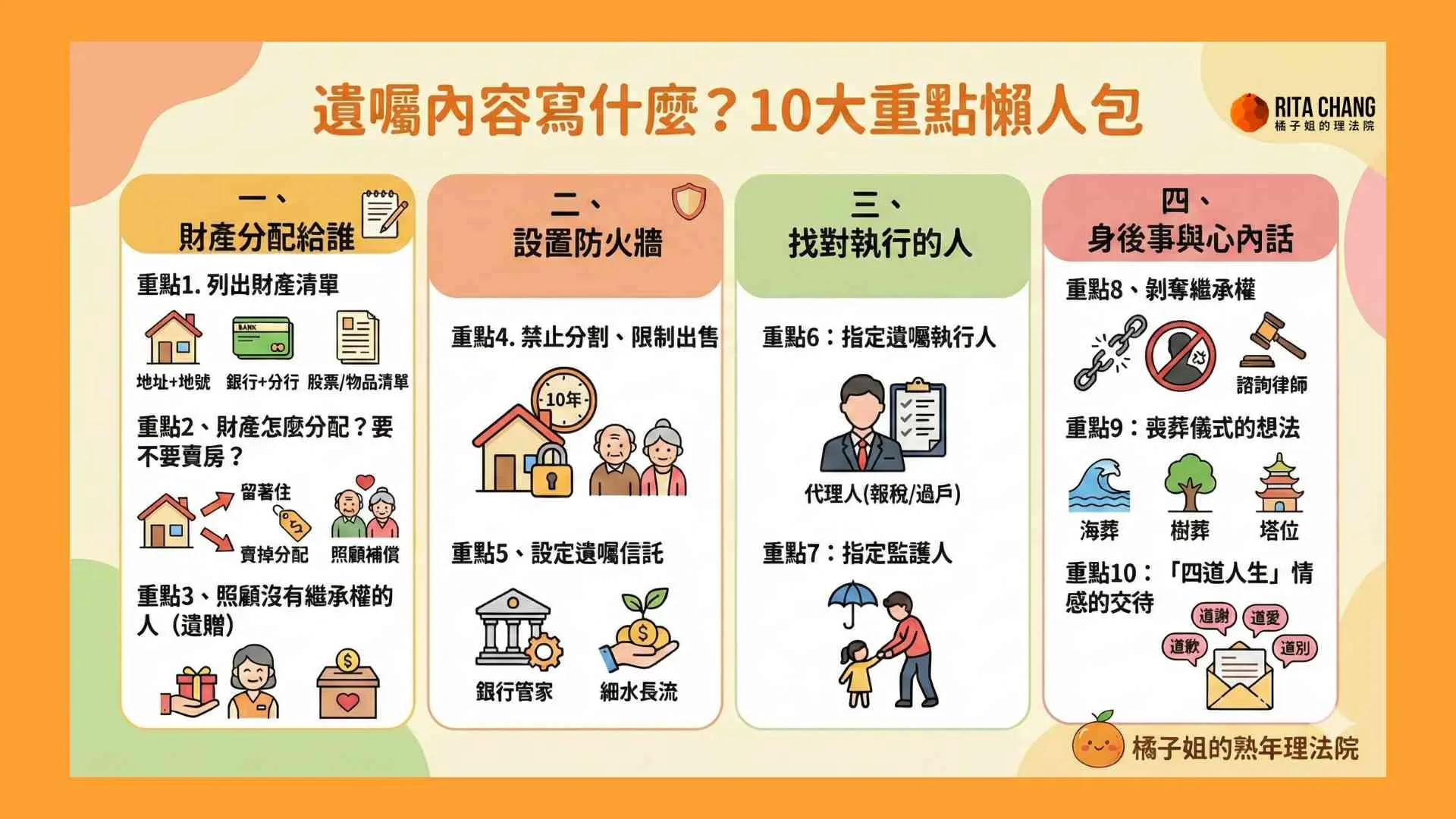 遺囑內容到底要寫什麼?橘子姐整理 10 大撰寫重點:從財產分配、遺囑信託到指定監護人,教你留愛不留遺憾。