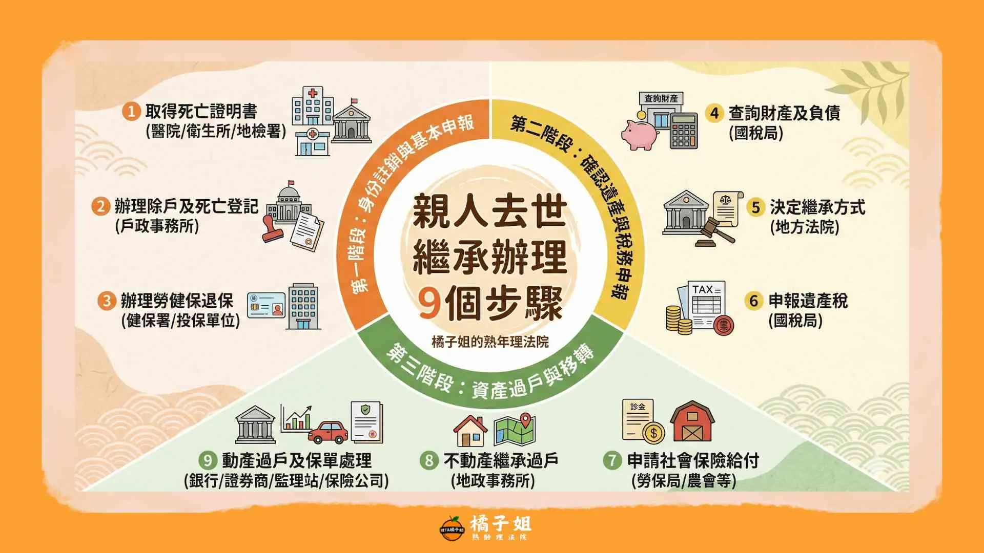 親人過世繼承怎麼辦?本文整理繼承辦理9大步驟懶人包:涵蓋除戶登記、查詢金融遺產、遺產稅申報到不動產過戶。搞懂三階段流程與辦理期限,按部就班圓滿處理身後事,避免稅務罰款與糾紛。