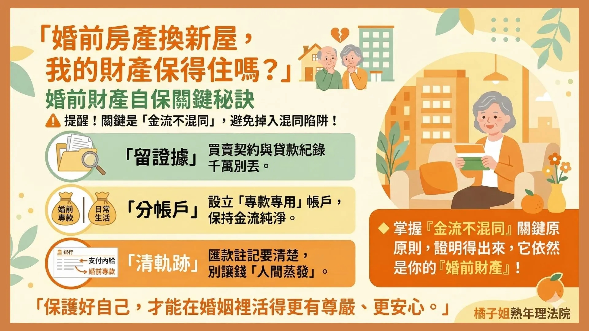 我們這一輩的人,總覺得跟另一半「算這麼清楚」好像很傷感情。但實際上,清楚的財務邊界,才是老後生活品質的保障。 保護好婚前財產,並不是在預設會離婚,而是給自己一份應有的尊嚴。當你有了這份底氣,你對家庭的付出會更純粹,因為你深知,無論世界如何變動,你都有足夠的力量照顧好自己。