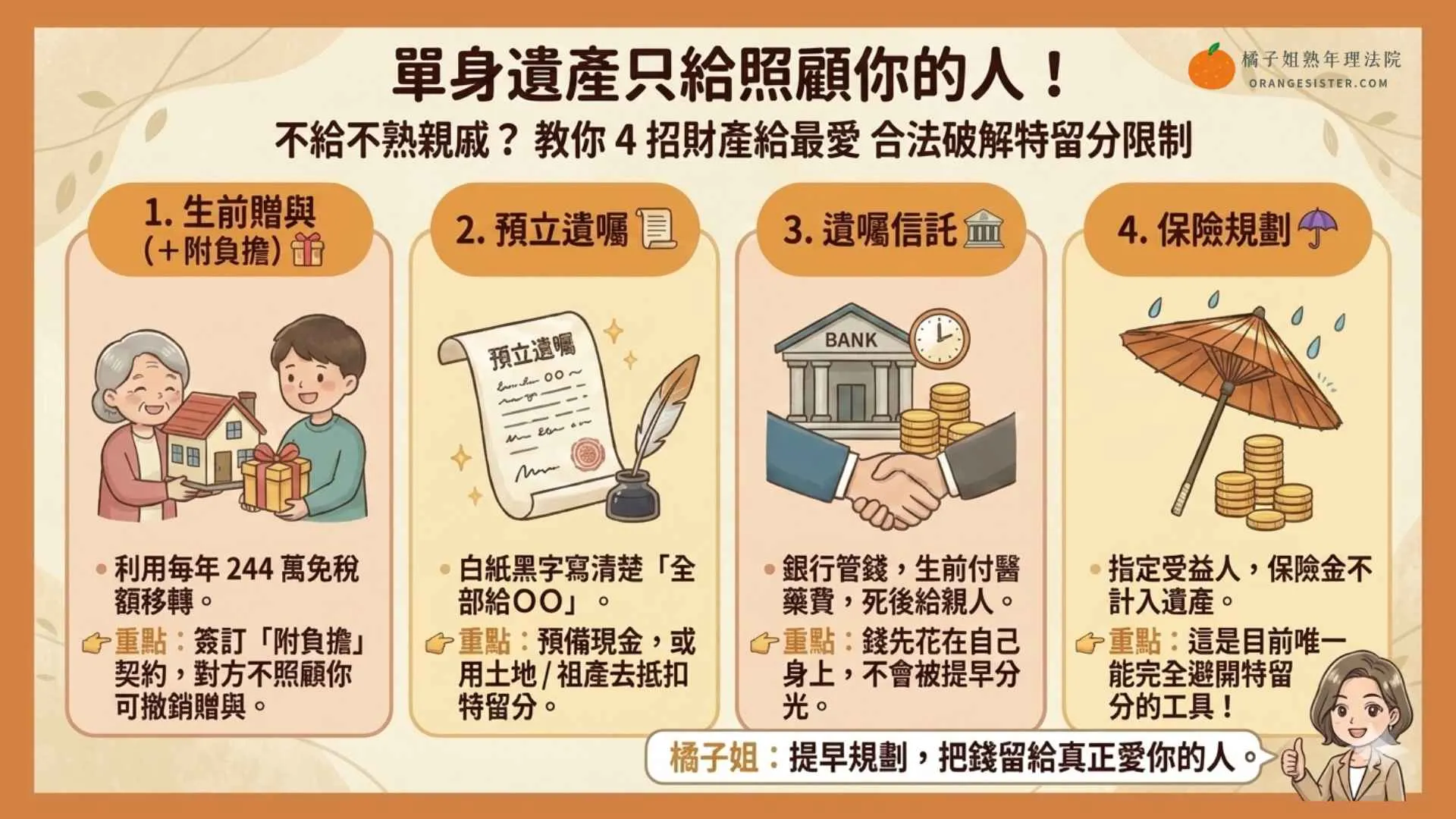 單身族的遺產規劃戰略:透過生前贈與、遺囑、信託與保險,在法律允許範圍內破解「特留分」限制,把財產留給真正愛你的家人。