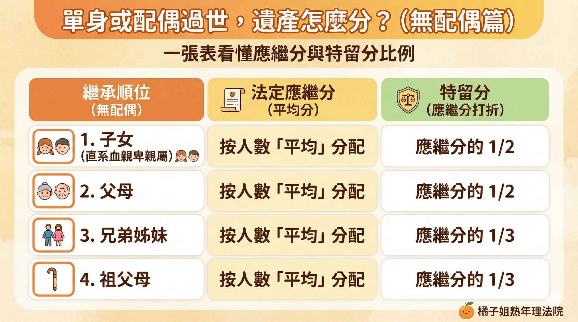 單身因為沒有配偶和子女,遺產繼承順位會變成: