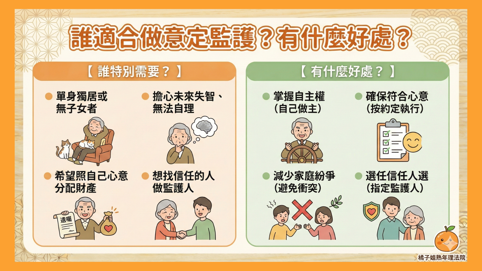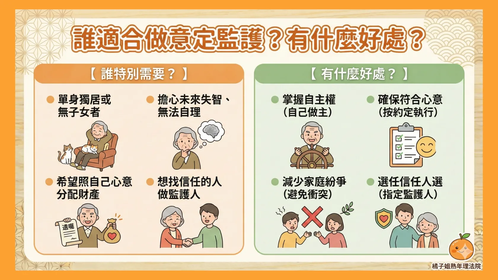 最大的好處是可以在自己頭腦清楚時,事先選好自己信任的人,未來才不會被別人隨意決定。這等於是把「晚年自主權」牢牢握在手中,維護自己的生活與尊嚴,避免晚景淒涼。