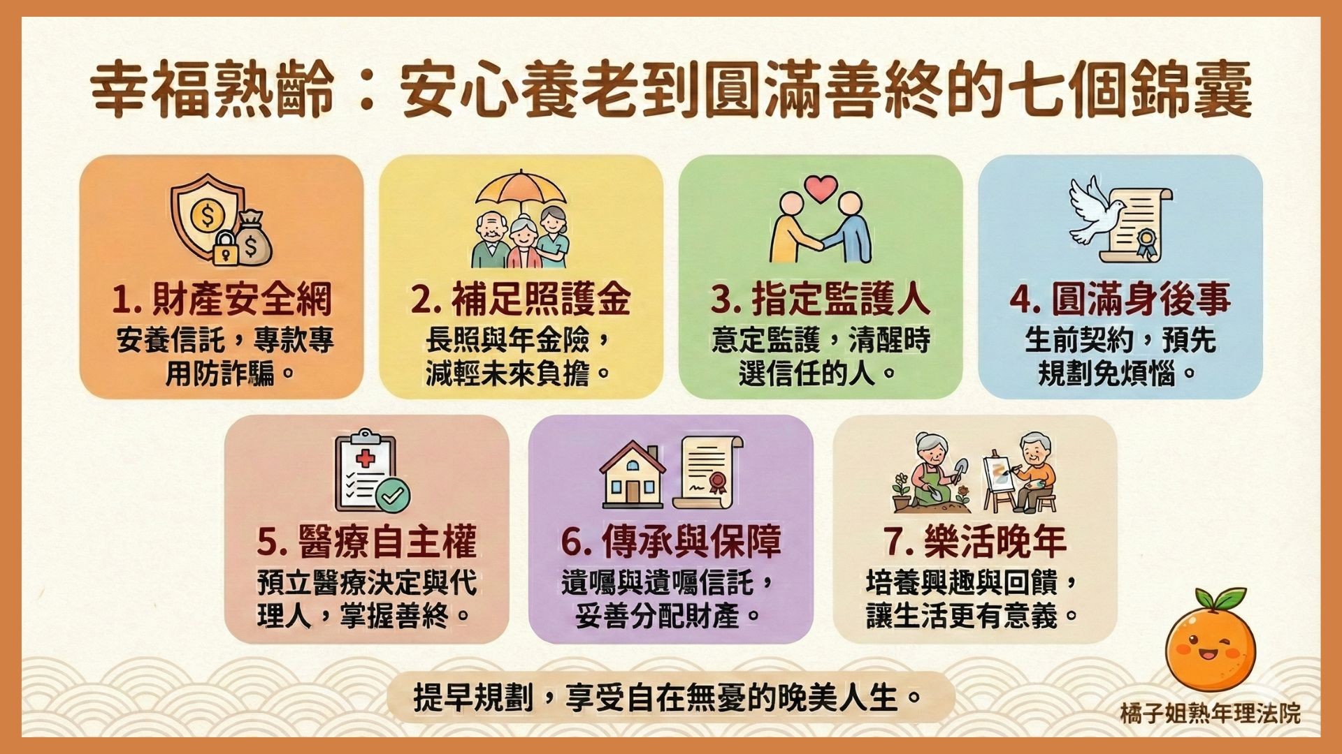今天就和大家分享「生前身後七件事」,一步步幫自己設下保護網,讓我們可以優雅慢老。
